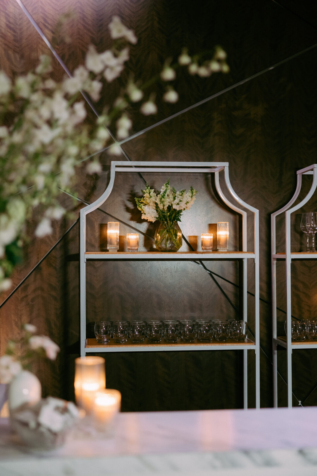 PLEASE NOTE: Some photos show shelving with glass shelves, but all shelves are oak wood and NOT glass.
