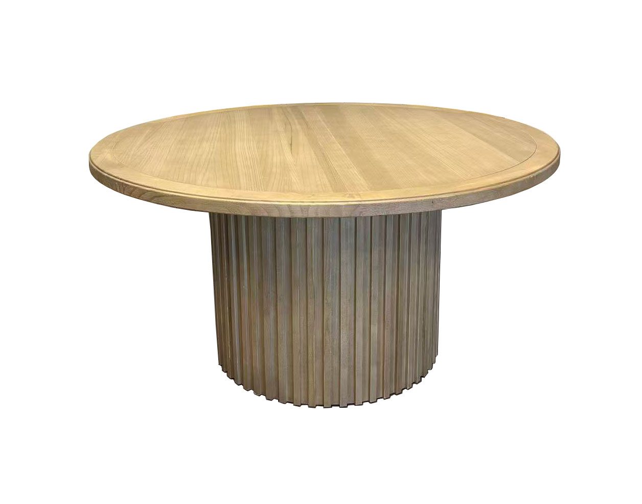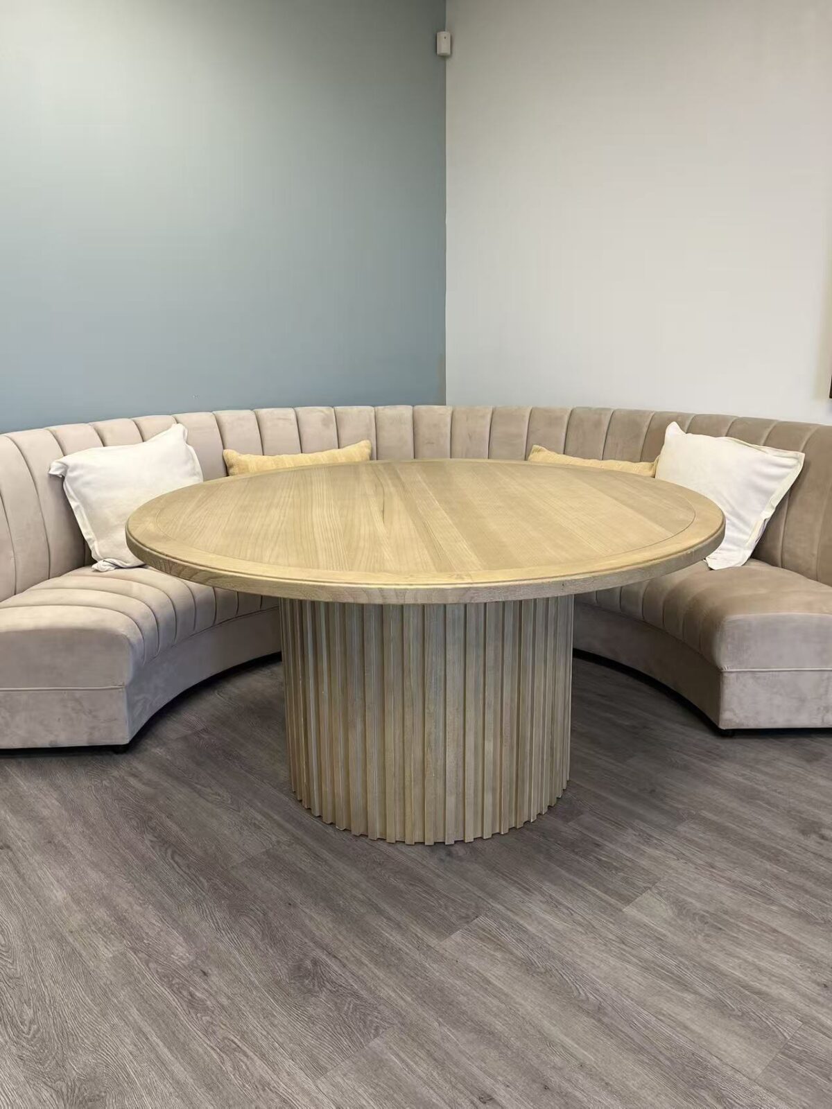 Wood table in Natural color, base of table mimics a sunray. Pairs nicely with our Half Moon Banquettes for seating and our Sunray High Cocktail Table!