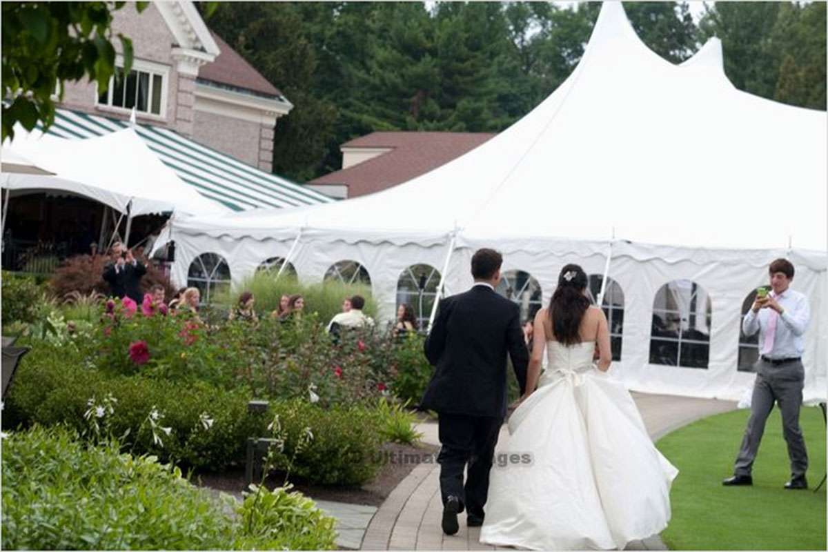 Spring is a wonderful time of year to get married, and we love this couple’s timeless, classic taste: a 60 x 100 rope and pole tent with windowed sidewall, nestled in a rose garden at Country Club of Rochester.